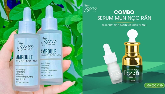 Bộ đôi trị mụn nọc rắn và tế bào gốc nhau thai cừu: Serum Mụn Nọc Rắn xóa bỏ các loại mụn trứng cá và tái tạo da mới. Kết hợp với Tế bào gốc Ampoule Tyra nhau thai cừu Collagen tinh dầu bơ để cấp ẩm, làm mềm da, thúc đẩy sản sinh tế bào mới nhanh hơn và giúp làn da mịn màng, khỏe khoắn.