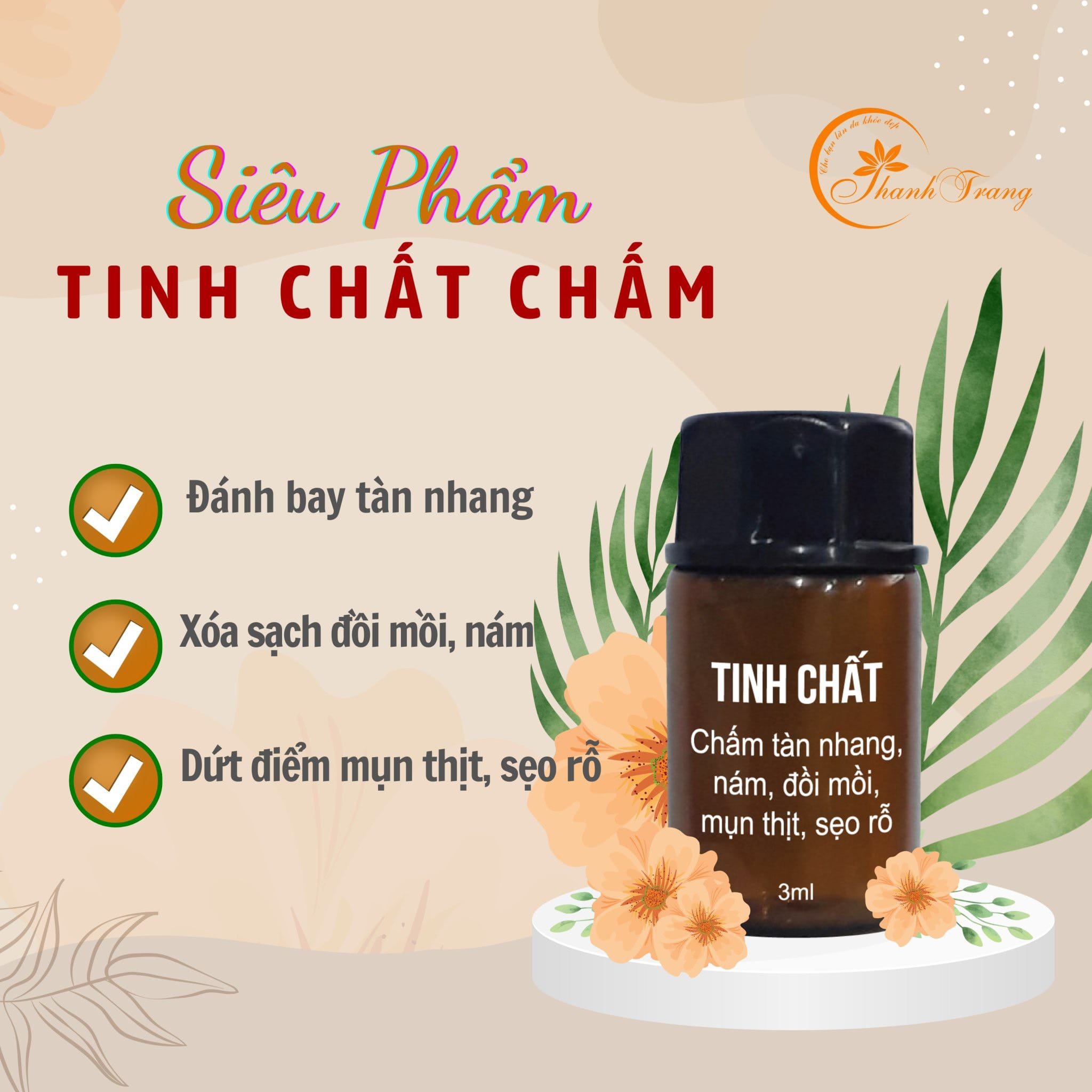 Một sự kết hợp hoàn hảo khác cùng với Linh Chi Vi Mụn là Tinh chất chấm nám, tàn nhang, đồi mồi, mụn thịt, sẹo rỗ. Chấm tinh chất này lên vùng da bị nám, tàn nhang, đồi mồi hoặc mụn thịt, sẹo rỗ sẽ đẩy hắc sắc tố lên. Sau đó là quá trình bóc tách để gom thành vảy. Tái tạo da đông y Thanh Trang có vai trò thúc đẩy làm bong những vảy nám, vảy tàn nhang, đồi mồi, mụn thịt.